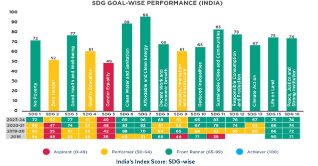 This federal and decentralized model has helped India align the SDGs with its flagship schemes like Poshan Abhiyaan, Swachh Bharat Mission, Jal Jeevan Mission, and Digital India. 2. India’s Progress Across Major Goals