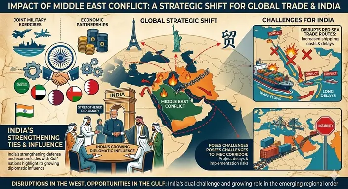 The Middle East Crisis: Geoeconomic Shifts and the Strategic Impact on India The protracted conflict in the Middle East, violently reignited by Operation Al-Aqsa Flood on October 7, 2023, has fundamentally shattered the region's strategic stability. What began as a localized confrontation has rapidly evolved into a multifaceted crisis involving major international and regional actors. Observers and officials alike are calling these developments a "strategic earthquake" that will usher in a profound reconfiguration of Middle Eastern alliances and power dynamics. While the immediate military and humanitarian impacts are concentrated in the Levant and the Red Sea, the ripple effects are reshaping global geoeconomics—bringing rising global powers like India directly into the strategic calculus of the region. Here is a look at how the shifting Middle Eastern environment connects to India's strategic and economic landscape. The Geoeconomic Battlefield: IMEC vs. BRI One of the most prominent ways India ties into the current Middle East strategic environment is through the clash of massive cross-continental infrastructure projects. Prior to the October 7 attacks, the United States pushed forward a framework for regional economic cooperation known as the India-Middle East-Europe Economic Corridor (IMEC). The Vision: IMEC aims to link Washington's regional allies with international partners, creating a vast corridor stretching from India across the Middle East and into Europe. The Strategic Goal: US President Joe Biden considered this project a historic turning point and positioned it as a direct counter to China's expansive Belt and Road Initiative (BRI). The ongoing Middle East conflict heavily influences this geoeconomic competition. The rivalry between the US and China over controlling the vital trade routes that connect the East and West is currently fueling geopolitical tensions between the IMEC and BRI allegiances. Disrupted Trade Routes and Supply Chains For a rapidly growing economy like India, the stability of maritime trade routes is vital. The strategic rivalry over trade corridors has generated real-world complications for global commerce. Geopolitical tensions have made navigating critical chokepoints like the Bab al-Mandab and the Strait of Hormuz increasingly difficult. These disruptions directly harm economies by slowing down commerce between the East and the West. Consequently, ships are being forced to take the much longer Cape of Good Hope detour, which heightens the cost of transporting goods. Evolving Diplomatic and Defense Dynamics The crisis has also accelerated diplomatic and defense maneuvering, illustrating the multipolar reality of today's Middle East where India plays an increasingly prominent role. Elevated Defense Benchmarks: The United States has leveraged the current regional crisis to revitalize alliances and forge new defense partnerships. For example, the US recently elevated its defense agreement with the UAE to the level of a "major defense partner". This specific designation was noted as being similar to the highly elevated defense relationship the US already shares with India. Gulf Diplomatic Outreach: Regional powers are also looking to diversify their partnerships rather than relying solely on traditional Western guarantors. The Gulf Cooperation Council (GCC) has demonstrated a proactive approach to this crisis by initiating joint ministerial meetings with India, alongside other major nations like Brazil and Russia. Conclusion The current Middle East conflict is not just reshaping the borders of influence for Israel, Iran, and the US; it is testing the viability of global trade corridors and multipolar diplomacy. As the United States and China vie for infrastructural dominance, and regional powers attempt to forge independent paths, India’s role as a cornerstone of the IMEC and a key diplomatic partner for the Gulf states places it right at the intersection of the Middle East's emerging new order.