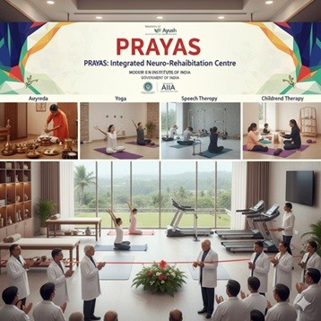 The Ministry of Ayush has launched “PRAYAS”, India’s first-of-its-kind Integrated Neuro-Rehabilitation Centre at the All India Institute of Ayurveda (AIIA), Goa. The initiative represents a milestone in India’s health sector by integrating Ayurveda, Yoga, Physiotherapy, Speech Therapy, Occupational Therapy, and Modern Pediatric Neurology under one roof. आयुष मंत्रालय ने अखिल भारतीय आयुर्वेद संस्थान (AIIA), गोवा में देश का पहला एकीकृत न्यूरो पुनर्वास केंद्र “प्रयास” शुरू किया है। यह पहल आयुर्वेद, योग और आधुनिक चिकित्सा को एकीकृत कर रोगियों के लिए समग्र देखभाल का एक नया मॉडल प्रस्तुत करती है।