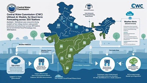 The CWC is using advanced AI/ML models for short-term flood forecasting at 350 stations, helping state governments with timely alerts and disaster mitigation. CWC, 350 स्टेशनों पर अल्पकालिक बाढ़ पूर्वानुमान के लिए उन्नत AI/ML मॉडल का उपयोग कर रहा है, जो राज्य सरकारों को समय पर अलर्ट और आपदा प्रबंधन में मदद करता है।