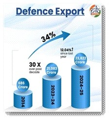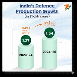वित्त वर्ष 2024-25 में भारत का रक्षा उत्पादन 1.54 लाख करोड़ रुपये तक पहुंच गया, जो अब तक का सर्वोच्च स्तर है। भारत का रक्षा निर्यात वित्त वर्ष 2024-25 में रिकॉर्ड 23,622 करोड़ रुपये तक पहुंच गया, जो 2014 में 1,000 करोड़ रुपये से भी कम था।