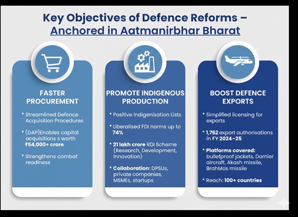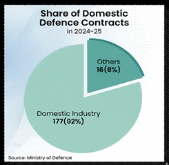 भारत का स्वदेशी रक्षा उत्पादन वित्त वर्ष 2023-24 में रिकॉर्ड 1,27,434 करोड़ रुपये तक पहुंच गया है, जो वर्ष 2014-15 के 46,429 करोड़ रुपये की तुलना में 174% की उल्लेखनीय वृद्धि को दर्शाता है। वर्तमान में भारत अमरीका, फ्रांस और आर्मेनिया सहित 100 से अधिक देशों को रक्षा उपकरणों का निर्यात कर रहा है। कुल रक्षा उत्पादन में रक्षा सार्वजनिक क्षेत्र उपक्रमों (डीपीएसयू) और अन्य सार्वजनिक उपक्रमों का योगदान लगभग 77% है, जबकि निजी क्षेत्र का योगदान 23% तक पहुंच गया है — जो वित्त वर्ष 2023-24 के 21% से बढ़कर 2024-25 में दर्ज किया गया है। सरकार ने वर्ष 2029 तक 3 लाख करोड़ रुपयेके रक्षा विनिर्माण और 50,000 करोड़ रुपये के रक्षा निर्यात का महत्वाकांक्षी लक्ष्य निर्धारित किया है।