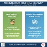 पारंपरिक चिकित्सा पर विश्व स्वास्थ्य संगठन (डब्ल्यूएचओ) के दूसरे वैश्विक शिखर सम्मेलन के अवसर पर जारी “दिल्ली घोषणापत्र” के साथ ही एकीकृत चिकित्सा में नये अध्याय की शुरुआत हुई है। पारंपरिक चिकित्सा को सुरक्षित, प्रभावी और साक्ष्य-आधारित रूप में राष्ट्रीय स्वास्थ्य प्रणालियों, विशेषकर प्राथमिक स्वास्थ्य देखभाल के माध्यम से सार्वभौमिक स्वास्थ्य कवरेज (UHC) पर जोर देते हुये इस घोषणापत्र ने पारंपरिक और आधुनिक चिकित्सा में उभर कर सामने आये नये साक्ष्यों का संज्ञान लिया है। The "Delhi Declaration," issued on the occasion of the World Health Organization's (WHO) second global summit on traditional medicine, marks the beginning of a new chapter in integrated medicine. This declaration emphasizes the integration of traditional medicine into national health systems, particularly through primary healthcare, to achieve universal health coverage (UHC), while acknowledging the emerging evidence in both traditional and modern medicine regarding its safety, effectiveness, and evidence-based practices.