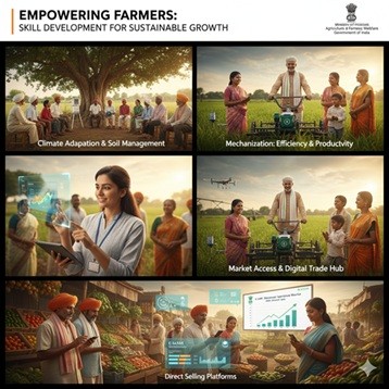 Empowering farmers is a critical pillar of India’s agricultural strategy. With nearly two-thirds of India’s population living in rural areas and about half dependent on agriculture for livelihood, strengthening farmers’ capacities is essential for inclusive and sustainable growth. Farmers today face complex challenges—climate adaptation, soil management, mechanization, and market access—necessitating a focus on skill development and training. किसानों का सशक्त होना भारत की कृषि रणनीति का प्रमुख आधार है। देश की लगभग दो-तिहाई जनसंख्या ग्रामीण क्षेत्रों में रहती है और लगभग आधी आबादी अपनी आजीविका के लिए कृषि पर निर्भर है। इसलिए समावेशी और टिकाऊ विकास के लिए किसानों के कौशल और क्षमताओं को सुदृढ़ करना आवश्यक है। वर्तमान समय में किसानों के सामने जलवायु परिवर्तन, मृदा प्रबंधन, यंत्रीकरण और बाजार तक पहुंच जैसी जटिल चुनौतियाँ हैं, जिन्हें प्रशिक्षण और कौशल विकास से ही सुलझाया जा सकता है।