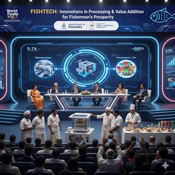 On the occasion of World Food India 2025, the Department of Fisheries (DoF), under the Ministry of Fisheries, Animal Husbandry and Dairying (MoFAHD), organized a technical session titled “FishTech: Innovations in Processing and Value Addition for Fishermen’s Prosperity” at Bharat Mandapam, New Delhi. विश्व खाद्य भारत 2025 के अवसर पर मत्स्यपालन, पशुपालन एवं डेयरी मंत्रालय (एमओएफएएचडी) के तहत मत्स्यपालन विभाग (डीओएफ) ने “मछुआरों की समृद्धि के लिए फिशटेक: प्रसंस्करण और मूल्य संवर्धन में नवाचार” विषय पर एक तकनीकी सत्र का आयोजन भारत मंडपम, नई दिल्ली में किया।