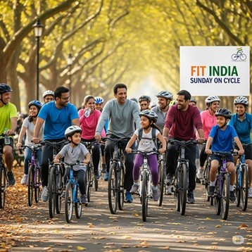 The Fit India Sunday on Cycle campaign is a nationwide initiative by MYAS that encourages citizens to cycle every Sunday, promoting health and fitness across India. फिट इंडिया संडे ऑन साइकिल अभियान MYAS की एक राष्ट्रव्यापी पहल है जो नागरिकों को हर रविवार साइकिल चलाने के लिए प्रोत्साहित करती है, जिससे पूरे भारत में स्वास्थ्य और फिटनेस को बढ़ावा मिल रहा है।