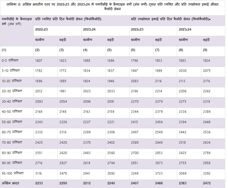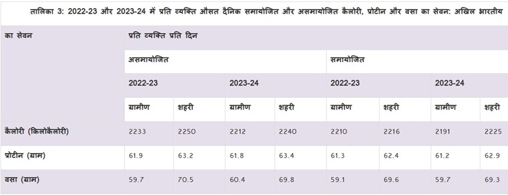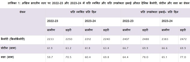I. औसत पोषक तत्व सेवन 2022-23 और 2023-24 दोनों अवधियों के लिए अखिल भारतीय स्तर पर औसत प्रति व्यक्ति प्रति दिन कैलोरी सेवन और प्रति उपभोक्ता इकाई प्रति दिन कैलोरी सेवन नीचे तालिका 1 में दिया गया है:
