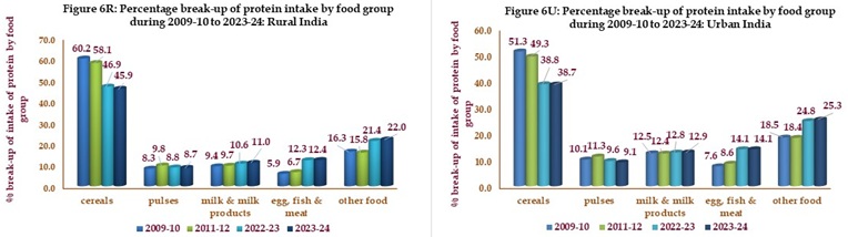 V. खाद्य श्रेणी के अनुसार प्रोटीन सेवन के रुझान: अखिल भारत 6R और 6U आंकड़े 2009-10 से 2023-24 की अवधि के दौरान पूरे भारत में खाद्य समूहों के अनुसार प्रोटीन सेवन का प्रतिशत विवरण दर्शाते हैं। वर्ष 2009-10 के स्तर से प्रोटीन सेवन में अनाज का योगदान ग्रामीण भारत में लगभग 14 प्रतिशत और शहरी भारत में लगभग 12 प्रतिशत कम हुआ है। अनाज के हिस्से में गिरावट को ग्रामीण और शहरी भारत में अंडे, मछली और मांस, अन्य खाद्य पदार्थों के हिस्से में उल्लेखनीय वृद्धि और दूध और दूध उत्पादों के हिस्से में मामूली वृद्धि द्वारा संतुलित किया गया है।