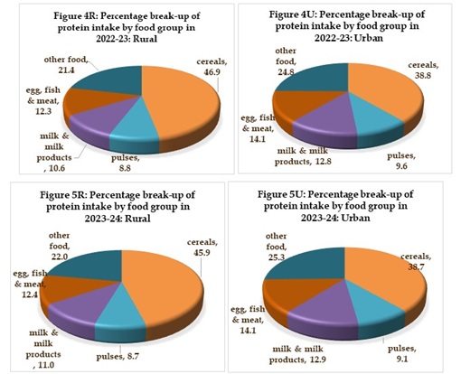 IV. अखिल भारतीय स्तर पर खाद्य श्रेणी के अनुसार प्रोटीन सेवन का प्रतिशत विवरण अखिल भारतीय स्तर पर पांच खाद्य समूहों, जैसे अनाज, दालें, दूध और दूध से बने उत्पाद, अंडा/मछली/मांस और अन्य खाद्य पदार्थों में प्रोटीन सेवन का प्रतिशत विवरण 2022-23 की अवधि के लिए आंकड़े 4R और 4U में और 2023-24 के लिए आंकड़े 5R और 5U में क्रमशः ग्रामीण और शहरी क्षेत्रों के लिए प्रस्तुत किया गया है। पांच खाद्य समूहों में अनाज प्रोटीन का सबसे महत्वपूर्ण स्रोत बना हुआ है, दोनों अवधियों में ग्रामीण भारत के लिए इसकी हिस्सेदारी लगभग 46-47प्रतिशत और शहरी भारत के लिए लगभग 39प्रतिशत है।