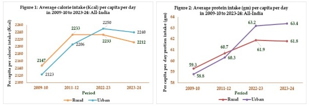 III. औसत पोषक तत्व सेवन का रुझान 2009-10 से 2023-24 तक अखिल भारतीय स्तर पर ग्रामीण और शहरी क्षेत्रों के लिए प्रति व्यक्ति प्रतिदिन औसत कैलोरी और प्रोटीन सेवन का अनुमान अलग-अलग आंकड़े 1 और 2 में दिखाए गए हैं।
