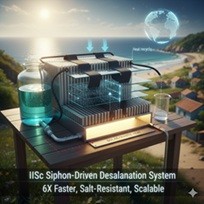 आईआईएससी के शोधकर्ताओं ने साइफन-आधारित तापीय विलवणीकरण प्रणाली विकसित की है जो पारंपरिक सौर स्टिल्स की तुलना में छह गुना अधिक स्वच्छ जल का उत्पादन करती है और नमक के जमाव को रोकती है। IISc researchers developed a siphon-driven thermal desalination system that produces over six times more clean water than traditional solar stills by using gravity and a thin air gap to prevent salt deposition.