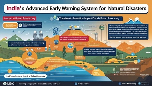 India’s advanced early warning system, coordinated by IMD and CWC, uses high-tech tools and impact-based forecasts to mitigate natural disaster damage and save lives. IMD और CWC द्वारा समन्वित भारत की उन्नत प्रारंभिक चेतावनी प्रणाली, प्राकृतिक आपदाओं से होने वाले नुकसान को कम करने और जीवन बचाने के लिए उच्च-तकनीकी उपकरणों और प्रभाव-आधारित पूर्वानुमानों का उपयोग करती है।