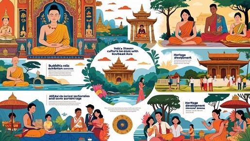 India is enhancing cultural ties with Southeast Asia through Buddhist relic exhibitions and schemes like ASEAN-India Tourism Year 2025, promoting heritage and tourism development. भारत बौद्ध अवशेषों की प्रदर्शनियों और आसियान-भारत पर्यटन वर्ष 2025 जैसी योजनाओं के माध्यम से दक्षिण-पूर्व एशिया के साथ सांस्कृतिक संबंधों को मजबूत कर रहा है, जो विरासत और पर्यटन विकास को बढ़ावा दे रहा है।