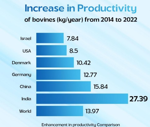 India continues to hold the top position globally in milk production, contributing about one-fourth of the world’s total supply. The dairy sector has emerged as the largest agricultural product segment in India, accounting for 5% of the national economy and providing direct employment to more than 80 million farmers. भारत विश्व में दुग्ध उत्पादन में पहले स्थान पर बना हुआ है और वैश्विक आपूर्ति का लगभग एक-चौथाई योगदान करता है। डेयरी क्षेत्र भारत का सबसे बड़ा कृषि उत्पाद है, जो राष्ट्रीय अर्थव्यवस्था में लगभग 5 प्रतिशत का योगदान देता है और 8 करोड़ से अधिक कृषकों को प्रत्यक्ष रोजगार प्रदान करता है।
