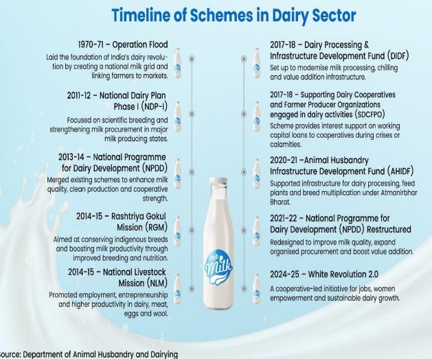 Over the past decade, milk production has increased by 63.56%, from 146.3 million tonnes to 239.3 million tonnes. Per capita milk availability has also risen by 48%, reaching 471 grams per person per day in 2023–24. In 2024–25, a total of 565.55 lakh artificial inseminations were carried out across the country, improving productivity and genetic potential among livestock. One shining example of the dairy revolution is the success story of Gurvinder Kaur from Ajauli village in Punjab’s Rupnagar district. After receiving training from the Dairy Development Department in 2014, she started with one Holstein Friesian cow and has since expanded to four high-yielding cows, producing nearly 90 litres of milk daily. Selling to Verka Dairy and local customers, she earns a stable income and has gained community recognition. Her use of technology—fodder cutter, milking machine, and silage unit—shows how innovation can boost profits and efficiency. Milk is considered one of the most complete foods, rich in proteins, minerals, vitamins, lactose, and fats, supporting growth, bone health, and active lifestyles. The dairy sector, led by small and marginal farmers and with major participation by women, plays a pivotal role in ensuring nutritional security and inclusive rural growth. During 2014–15 to 2023–24, India’s dairy sector witnessed an impressive 63.56% increase in milk production and a 5.7% annual growth rate—outpacing the global average. Livestock productivity grew by 27.39% between 2014 and 2022, the highest in the world. These gains are attributed to flagship initiatives like the Rashtriya Gokul Mission and the National Dairy Plan. India’s cooperative dairy network—comprising 22 milk federations, 241 district unions, and 25 milk producer organizations—covers 2.35 lakh villages and 1.72 crore dairy farmers. Remarkably, women constitute about 70% of the dairy workforce, and 35% of cooperative members. Over 48,000 women-led dairy cooperatives are driving empowerment at the grassroots. The all-women Shri Ja Milk Producer Organization received the International Dairy Federation Innovation Award in Chicago, reflecting the strength of India’s women-led dairy initiatives. India’s leadership in dairy stems from its cooperative model established during the White Revolution spearheaded by Verghese Kurien and the National Dairy Development Board (NDDB) in 1965. The Operation Flood program, launched in 1970, transformed India into the world’s largest milk producer by linking rural producers with urban markets. Since then, India’s dairy progress has been supported by major schemes such as:
