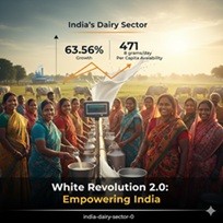 The Rashtriya Gokul Mission remains a cornerstone, focusing on the genetic improvement and conservation of indigenous breeds. With ₹3400 crore allocated for 2021–26, the mission has achieved a 63.56% increase in milk output and a 26.34% rise in productivity over the past decade. Artificial insemination coverage has expanded to 33% of breedable cattle, with over 14.12 crore procedures benefiting 5.54 crore farmers. Initiatives like Multi-purpose AI Technicians (MAITRIs) and sex-sorted semen technology are boosting productivity, while Ethno Veterinary Medicine (EVM) offers sustainable health management. The vision of White Revolution 2.0 (2024–29) focuses on cooperative expansion, women empowerment, and sustainable dairy growth. With plans to form 75,000 new cooperatives and modernize 46,000 existing ones, India aims to raise milk procurement to over 1007 lakh kilograms per day by 2029. The future of India’s dairy sector lies in strengthening rural livelihoods, empowering women, enhancing productivity through science, and sustaining its position as the world’s dairy powerhouse.