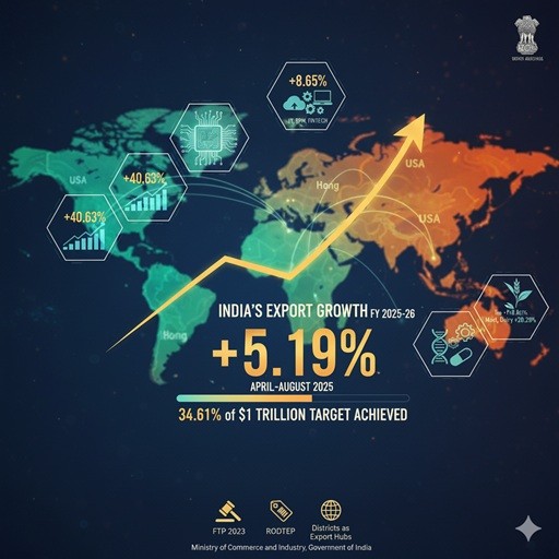 India's exports rose 5.19% (Apr-Aug 2025); services and electronics surged, achieving 34.61% of $1 Trillion target. |(भारत का निर्यात 5.19% बढ़ा (अप्रैल-अगस्त 2025); सेवा, इलेक्ट्रॉनिक्स में उछाल, $1 ट्रिलियन लक्ष्य का 34.61% प्राप्त)