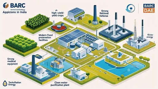 At present, nuclear power contributes about 3 per cent of the total power generated in the country. In the year 2024-25, 56681 million units (MUs) of electricity were generated by nuclear power plants. The government is striving to increase nuclear fuel sources by increasing domestic production and imports from diversified sources. The government has announced an ambitious nuclear energy mission with a target of reaching 100 GW of nuclear power capacity by 2047. At present, the installed nuclear power capacity in the country consists of 24 reactors with a total capacity of 8780 MW (excluding RAPS-1 (100 MW) under extended shutdown). Upon its gradual completion, the installed nuclear power capacity is expected to reach 22380 MW by the year 2031-32. Applications of Nuclear Energy in Various Fields Nuclear energy is a versatile resource with applications extending far beyond electricity generation. Organizations like the Bhabha Atomic Research Centre (BARC) and the Department of Atomic Energy (DAE) have developed numerous technologies to leverage nuclear energy for societal benefits. 1. Nuclear Agriculture 🧑🌾 New Crop Varieties: Through radiation-induced mutation and cross-breeding, over 71 new high-yielding crop varieties of rice, pulses, oilseeds, and wheat have been developed. Key Features: These varieties have qualities like early maturity, tolerance to biotic and abiotic stress, and climate resilience, which provide significant economic benefits to farmers. Controlling Soil-borne Diseases: Crop damage from soil-borne diseases can be reduced using gamma ray-induced Trichoderma mutant strains. 2. Food Preservation 🍎 Radiation Processing (Irradiation): This technique is effectively used to increase the shelf-life of agricultural products, fish, and spices. Examples: Increasing the shelf-life of mangoes to 35 days has enabled cost-effective export via sea routes. Extending the shelf-life of onions and potatoes to 7.5 and 8 months, respectively, reduces spoilage and benefits farmers. "Shivay" Technology: A liquid nitrogen-based refrigeration technique for transporting fruits and vegetables in a controlled temperature and humidity environment. It is economical and eco-friendly as it consumes no diesel or electricity. "Matsya" System: Based on "Shivay" technology, this system is specifically developed for the transportation of fresh fish. 3. Defence and Security 🛡️ Bhabha Kavach: An indigenously developed, lightweight, and cost-effective bullet-proof jacket created by BARC. It is qualified for Threat Level III+ (BIS Level 5 protection). Usage: The jacket is used by security forces such as the Indian Army, BSF, CRPF, and CISF. Cargo Container Scanner: An indigenous technology that serves as an import substitute for screening cargo. 4. Healthcare 🩺 Radioisotope Production: Useful radioisotopes like Iodine-131, Lutetium-177, and Samarium-153 are produced from nuclear reactors for use in healthcare. Cancer Treatment: Ruthenium-106 (Ru-106) eye plaques are used for treating eye cancer. Strontium-89 (Sr-89) is used for the palliative care of bone metastatic cancer. Medical Equipment Sterilization: An industrial electron linac is used for the terminal sterilization of medical devices. Import Substitution: BARC's indigenous production of several radiopharmaceuticals has reduced treatment costs for common people. 5. Water Purification 💧 Radiation-Grafted Cotton Fabric: A new technique using radiation-grafted cotton fabric effectively removes dyes from textile and dyeing industry wastewater. Benefits: This is a low-cost, efficient solution for environmental protection, as the treated water can be reused for industrial purposes. 6. Other Key Contributions ⚡ Power Generation: Nuclear power plants generated approximately 56,681 million units of clean electricity, saving about 49 million tons of CO2 emissions. Kalpakkam Mini Reactor (KAMINI): This reactor is used for neutron radiography, neutron shielding, and neutron activation of components critical for nuclear and strategic sectors, including pyro-devices used in space programs. Industrial Use: Radioisotopes like Iridium-192 (Ir-192) are supplied to industries for non-destructive testing and troubleshooting in sectors like petrochemicals. The multi-faceted applications of nuclear energy are playing a crucial role in India's social and economic development.