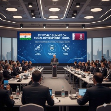 From 4–6 November 2025, Union Minister Dr. Mansukh Mandaviya led India’s delegation at the 2nd World Summit on Social Development in Doha, presenting India’s achievements in poverty eradication, social security expansion, and inclusive growth. 4-6 नवंबर 2025 तक, केंद्रीय मंत्री डॉ. मनसुख मंडाविया ने दोहा में सामाजिक विकास पर दूसरे विश्व शिखर सम्मेलन में भारत के प्रतिनिधिमंडल का नेतृत्व किया, जिसमें गरीबी उन्मूलन, सामाजिक सुरक्षा विस्तार और समावेशी विकास में भारत की उपलब्धियों को प्रस्तुत किया गया।
