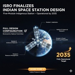 इसरो ने पांच मॉड्यूल वाले स्वदेशी भारतीय अंतरिक्ष स्टेशन की पूरी आकृति तैयार कर ली है। इसके 2035 तक पूरी तरह से परिचालन में आने की उम्मीद है। राष्ट्रीय स्तरीय समीक्षा समिति ने इसकी पूर्ण आकृति की समीक्षा की है। ISRO has completed the full design configuration of the five-module indigenous Indian Space Station. The station is expected to be fully operational by 2035. The complete design has been reviewed by a national-level review committee.