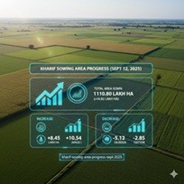 The total Kharif sowing area for 2025-26 as of September 12, 2025, reached 1110.80 Lakh Hectares, marking an increase of 14.92 Lakh Hectares compared to the area sown in 2024-25 (1095.88 Lakh Hectares). Key Trends: Major Increases (Area Growth): Coarse Cereals recorded the highest category increase (+12.17 Lakh Hectares), driven significantly by Maize (+10.54 Lakh Hectares). Rice saw a strong increase of +8.45 Lakh Hectares compared to the previous year. Sugarcane also showed an increase of +1.64 Lakh Hectares. Major Decreases (Area Contraction): Oilseeds experienced a decline of -5.12 Lakh Hectares overall. This drop was primarily due to Soybean, which saw a decrease of -5.81 Lakh Hectares. Cotton sowing area was down by -2.85 Lakh Hectares compared to 2024-25. Pulses: The overall Pulses area saw a marginal increase of +0.81 Lakh Hectares. Urad sowing increased by +1.51 Lakh Hectares, counteracting minor reductions in crops like Tur and Moong.