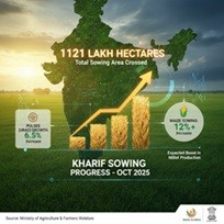 खरीफ बुवाई का कुल रकबा 1121 लाख हेक्टेयर पार कर गया (अक्टूबर 2025 तक)। मक्का के क्षेत्र में 12% से अधिक वृद्धि से बाजरा उत्पादन को बढ़ावा मिलेगा। Kharif sowing area crossed 1121 lakh hectares (as of Oct 2025). Maize area surged by over 12%, expecting a boost in millet production.