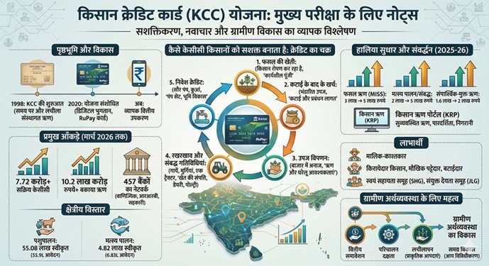 प्रमुख आँकड़े और प्रभाव (मार्च 2026 तक) सक्रिय कार्ड: देशभर में वर्तमान में 7.72 करोड़ से अधिक केसीसी सक्रिय हैं। ऋण संवितरण: केसीसी योजना के तहत कुल बकाया ऋण 10.2 लाख करोड़ रुपये को पार कर गया है। बैंकिंग नेटवर्क: यह योजना 457 बैंकों द्वारा लागू की गई है, जिनमें 37 वाणिज्यिक बैंक, 46 क्षेत्रीय ग्रामीण बैंक (RRB), और 374 सहकारी बैंक शामिल हैं। क्षेत्रीय विस्तार: पशुपालन: 55.9 लाख आवेदनों में से 55.08 लाख स्वीकार किए गए, जो उच्च पात्रता और नीतिगत सहायता का प्रदर्शन करते हैं। मत्स्य पालन: 6.83 लाख आवेदन प्राप्त हुए, जिनमें से 4.82 लाख ऋण स्वीकृत किए गए।