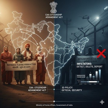 CAA grants citizenship to persecuted refugees; contrasts with infiltrators, citing drastic demographic changes in neighboring nations. (CAA धार्मिक रूप से प्रताड़ित शरणार्थियों को नागरिकता देता है; घुसपैठियों से भिन्न, पड़ोसी देशों में तीव्र जनसांख्यिकीय बदलाव।)