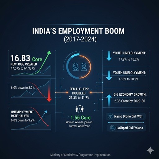 Key Data Points Total Employment Generation: Employment in India surged from 47.5 crore in 2017-18 to 64.33 crore in 2023-24, resulting in a net creation of 16.83 crore new jobs over six years. Decline in Unemployment Rate (UR): The UR has witnessed a sharp decline, falling from 6.0% in 2017-18 to 3.2% in 2023-24. Labour Force Participation Rate (LFPR): The LFPR for persons aged 15 years and above rose from 49.8% in 2017-18 to 60.1% in 2023-24. Worker Population Ratio (WPR): This ratio increased from 46.8% in 2017-18 to 58.2% in 2023-24. Youth Unemployment: The youth unemployment rate in the same period decreased from 17.8% to 10.2%, which is below the global average. Women's Leadership in the Workforce Female LFPR: The female Labour Force Participation Rate (15 years and above) has nearly doubled, increasing from 23.3% in 2017-18 to 41.7% in 2023-24. Formal Workforce Participation: 1.56 crore women have joined the formal workforce in the last seven years. Government Initiatives: Specific schemes like Namo Drone Didi (to empower women-led Self Help Groups (SHGs) with drone technology for agriculture services) and the Lakhpati Didi Yojana (targeting 3 crore 'Lakhpati Didis') are being implemented. Changes in Employment Patterns Shift Towards Formalization: Significant growth in net subscriber additions to the Employees' Provident Fund Organisation (EPFO) indicates increasing formalization and expansion of social security coverage. Rise in Self-Employment: The share of self-employment increased from 52.2% in 2017-18 to 58.4% in 2023-24. Decline in Informal Labour: The share of informal labour has decreased from 24.9% to 19.8% in 2023-24. The Rise of the Gig Economy: India's gig workforce is estimated to grow to 2.35 crore by 2029-30, supported by government measures like the Social Security Code, 2020 and the e-Shram portal. Key Government Schemes PM Viksit Bharat Rozgar Yojana: Launched in August 2025, its objective is to boost employment creation by supporting both employers and employees through incentives. PM Vishwakarma: Aims to provide holistic support to artisans and craftspeople to promote their traditional products and services. ITI Upgradation Scheme: Envisions upgrading 1000 Government ITIs into state-led, industry-managed skill institutions. Conclusion India's employment landscape is now transitioning beyond merely achieving GDP growth to translating it into the creation of productive, well-paying jobs. The government’s focus on skill development and technological upskilling will remain a crucial pillar for ensuring sustainable and inclusive economic progress. भारत में रोज़गार की स्थिति: यूपीएससी नोट्स यह नोट्स प्रेस सूचना ब्यूरो (PIB) की विज्ञप्ति पर आधारित है और सिविल सेवा परीक्षा के लिए महत्वपूर्ण है। प्रमुख आँकड़े (Key Data Points) कुल रोज़गार सृजन: 2017-18 में 47.5 करोड़ से बढ़कर 2023-24 में 64.33 करोड़ हो गया, जिससे छह वर्षों में 16.83 करोड़ नई नौकरियाँ सृजित हुईं। बेरोज़गारी दर (UR) में गिरावट: यह 2017-18 के 6.0% से तेज़ी से गिरकर 2023-24 में 3.2% हो गई। श्रम बल भागीदारी दर (LFPR): 15 वर्ष और उससे अधिक आयु के व्यक्तियों के लिए LFPR 2017-18 में 49.8% से बढ़कर 2023-24 में 60.1% हो गई। श्रमिक जनसंख्या अनुपात (WPR): यह 2017-18 में 46.8% से बढ़कर 2023-24 में 58.2% हो गया। युवा बेरोज़गारी: इसी अवधि में युवा बेरोज़गारी दर 17.8% से घटकर 10.2% हो गई, जो वैश्विक औसत से कम है। महिला श्रमशक्ति का नेतृत्व (Women Leading the Workforce) महिला LFPR: महिला श्रम बल भागीदारी दर (15 वर्ष और उससे अधिक) 2017-18 में 23.3% से बढ़कर 2023-24 में 41.7% हो गई (लगभग दोगुनी)। औपचारिक कार्यबल में भागीदारी: पिछले सात वर्षों में 1.56 करोड़ महिलाएँ औपचारिक कार्यबल में शामिल हुई हैं। सरकारी पहल: नमो ड्रोन दीदी (महिलाओं के नेतृत्व वाले स्वयं सहायता समूहों को कृषि सेवाओं के लिए ड्रोन तकनीक से सशक्त बनाना) और लखपति दीदी योजना (3 करोड़ 'लखपति दीदी' बनाने का लक्ष्य) जैसी विशेष पहलें लागू की जा रही हैं। रोज़गार पैटर्न में बदलाव (Changes in Employment Pattern) औपचारिकता की ओर: कर्मचारी भविष्य निधि संगठन (EPFO) में शुद्ध ग्राहक जुड़ाव में उल्लेखनीय वृद्धि हुई है, जो औपचारिकता के बढ़ते स्तर और सामाजिक सुरक्षा कवरेज में वृद्धि को दर्शाता है। स्वरोज़ग
