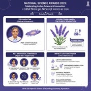 1. राष्ट्रीय विज्ञान पुरस्कार का ढांचा भारत सरकार द्वारा स्थापित यह पुरस्कार चार श्रेणियों में प्रदान किया जाता है: विज्ञान रत्न: विज्ञान और प्रौद्योगिकी के क्षेत्र में आजीवन उपलब्धि के लिए। विज्ञान श्री: विशिष्ट क्षेत्र में उत्कृष्ट योगदान के लिए। विज्ञान युवा-शांति स्वरूप भटनागर: 45 वर्ष से कम आयु के उभरते वैज्ञानिकों के लिए। विज्ञान टीम: तीन या अधिक वैज्ञानिकों की टीम द्वारा किए गए असाधारण कार्य के लिए। 2. प्रमुख सम्मान 2025 (Key Highlights) विज्ञान रत्न (मरणोपरांत) प्रोफेसर जयंत विष्णु नारलिकर: प्रख्यात खगोल भौतिक विज्ञानी (Astrophysicist) को उनके आजीवन योगदान के लिए देश के सर्वोच्च वैज्ञानिक सम्मान 'विज्ञान रत्न' से सम्मानित किया गया। विज्ञान टीम पुरस्कार: सीएसआईआर-अरोमा मिशन (पर्पल रिवोल्यूशन) उपलब्धि: जम्मू और कश्मीर में 'लैवेंडर' की खेती को बढ़ावा देकर 'पर्पल रिवोल्यूशन' (बैंगनी क्रांति) की शुरुआत करना। प्रभाव: इसने हिमालयी क्षेत्रों में कृषि-उद्यमिता के नए मार्ग खोले, किसानों की आय बढ़ाई और आवश्यक तेलों के आयात पर निर्भरता कम की। 3. श्रेणी-वार महत्वपूर्ण पुरस्कार विजेता