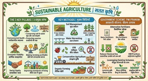 प्रमुख स्तंभ (Key Pillars) सतत कृषि मुख्य रूप से तीन स्तंभों पर आधारित होती है: पर्यावरण के अनुकूल (Environmental Health): मृदा उर्वरता बनाए रखना, जल संरक्षण और जैव विविधता की रक्षा। आर्थिक रूप से व्यवहार्य (Economic Viability): किसानों के लिए खेती को लाभदायक बनाना। सामाजिक न्याय (Social Equity): कृषि कार्यों में लगे लोगों के जीवन स्तर में सुधार। सतत कृषि की मुख्य विधियाँ मृदा प्रबंधन: फसल चक्र (Crop Rotation), अंतर-फसल (Inter-cropping) और हरी खाद का उपयोग। एकीकृत कीट प्रबंधन (IPM): रासायनिक कीटनाशकों के स्थान पर जैविक नियंत्रण का उपयोग। जल संचयन: ड्रिप सिंचाई (Drip Irrigation) और स्प्रिंकलर सिस्टम का प्रयोग। संरक्षण कृषि (Conservation Agriculture): न्यूनतम जुताई (Zero Tillage) ताकि मृदा की संरचना बनी रहे। जैविक खेती (Organic Farming): रसायनों का पूर्णतः त्याग। Relevant Point: SDG 2 संयुक्त राष्ट्र के सतत विकास लक्ष्य-2 (Sustainable Development Goal 2) का एक प्रमुख हिस्सा "सतत कृषि को बढ़ावा देना" है ताकि Zero Hunger के लक्ष्य को प्राप्त किया जा सके।