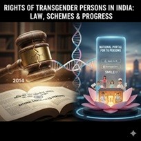 Landmark Supreme Court Judgement: Case: National Legal Services Authority (NALSA) vs. Union of India (2014). Recognition: Explicitly recognized transgender persons as the "Third Gender." Constitutional Guarantee: Guaranteed fundamental rights under Articles 14, 15, 19, and 21 of the Indian Constitution, ensuring equality, non-discrimination, dignity, and freedom. Transgender Persons (Protection of Rights) Act, 2019: Effective Date: January 10, 2020. Core Objective: Provides legal recognition, welfare measures, and protection against discrimination for transgender individuals. Key Provisions: Section 3: Prohibits discrimination in education, employment, healthcare, public services, etc. Section 4-7: Right to self-perceived gender identity; application for ID certificate via District Magistrate; revised certificate post-surgery. Section 8: Government's obligation for welfare schemes, inclusion, rescue, and rehabilitation. Section 16-18: Establishment of the National Council for Transgender Persons (NCTP). Section 19-20: Penalties for offenses like discrimination (punishable with up to 2 years imprisonment). Transgender Persons (Protection of Rights) Rules, 2020: Implemented: September 25, 2020, to operationalize the Act's provisions. Key Institutional Structures: Transgender Protection Cells (Rule 11(3)): Required to be established in states/UTs to monitor crimes and facilitate investigation/prosecution (29 cells established). Transgender Welfare Boards (TWB) (Rule 10(1)): Established to protect rights and promote welfare (23 TWBs established). Government Initiatives and Schemes National Council for Transgender Persons (NCTP): Constituted: August 21, 2020 (Reconstituted on November 16, 2023). Role: An advisory and statutory body under MoSJE to advise the Central Government on policies, monitor implementation, review activities, and redress grievances. Composition: Includes representatives from the Transgender community, NHRC, NCW, state governments, and NGOs. SMILE (Support for Marginalized Individuals for Livelihood and Enterprise) Scheme: Launched: February 2022 (By MoSJE). Objective: Comprehensive rehabilitation and empowerment of transgender persons and other marginalized communities. Components: Skill Development and Employment: Vocational training programs to enhance employability. Scholarship Schemes: Financial aid for transgender students from primary to secondary level to reduce dropouts. Holistic Medical Health: Ayushman Bharat TG Plus: Dedicated health insurance scheme providing ₹5 Lakhs per annum free medical coverage. Coverage: Gender-affirming care, Hormone Therapy, Sex Reassignment Surgery (SRS), and post-operative care. Safe Shelter: Provision for Garima Greh centers, providing basic amenities, food, medical care, and recreational facilities (18 Garima Grehs supported). National Portal for Transgender Persons: Launched: November 25, 2020. Service: A multi-lingual (English, Hindi, etc.) end-to-end online process for applying for and downloading Transgender Certificates and ID cards without visiting any office, ensuring transparency and ease of access. Conclusion and Future Path Progress: Recent years have seen significant legal and policy reforms led by the Central Government, establishing a strong foundation for affirmative action, legal recognition, and social security. Focus: The MoSJE continues to conduct awareness programs, capacity building, and national campaigns to reduce stigma and ensure the effective inclusion of transgender persons in policy frameworks and public life. Vision: India aims for a more just future, ensuring that transgender individuals live with dignity, autonomy, and opportunity, remaining central to the nation's democratic and human rights commitments.